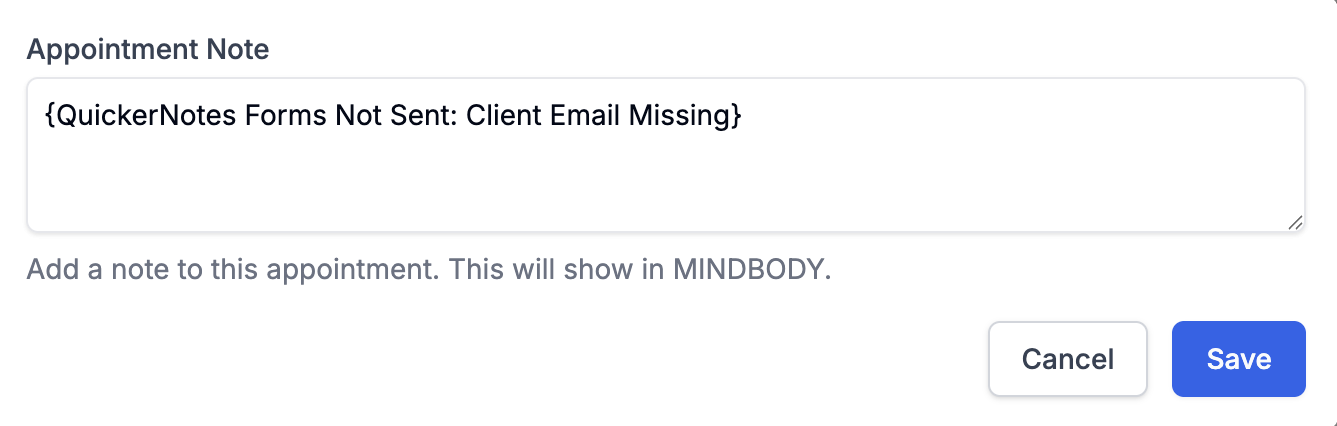 When a client books without an email, QuickerNotes adds a note to the appointment inside Mindbody.