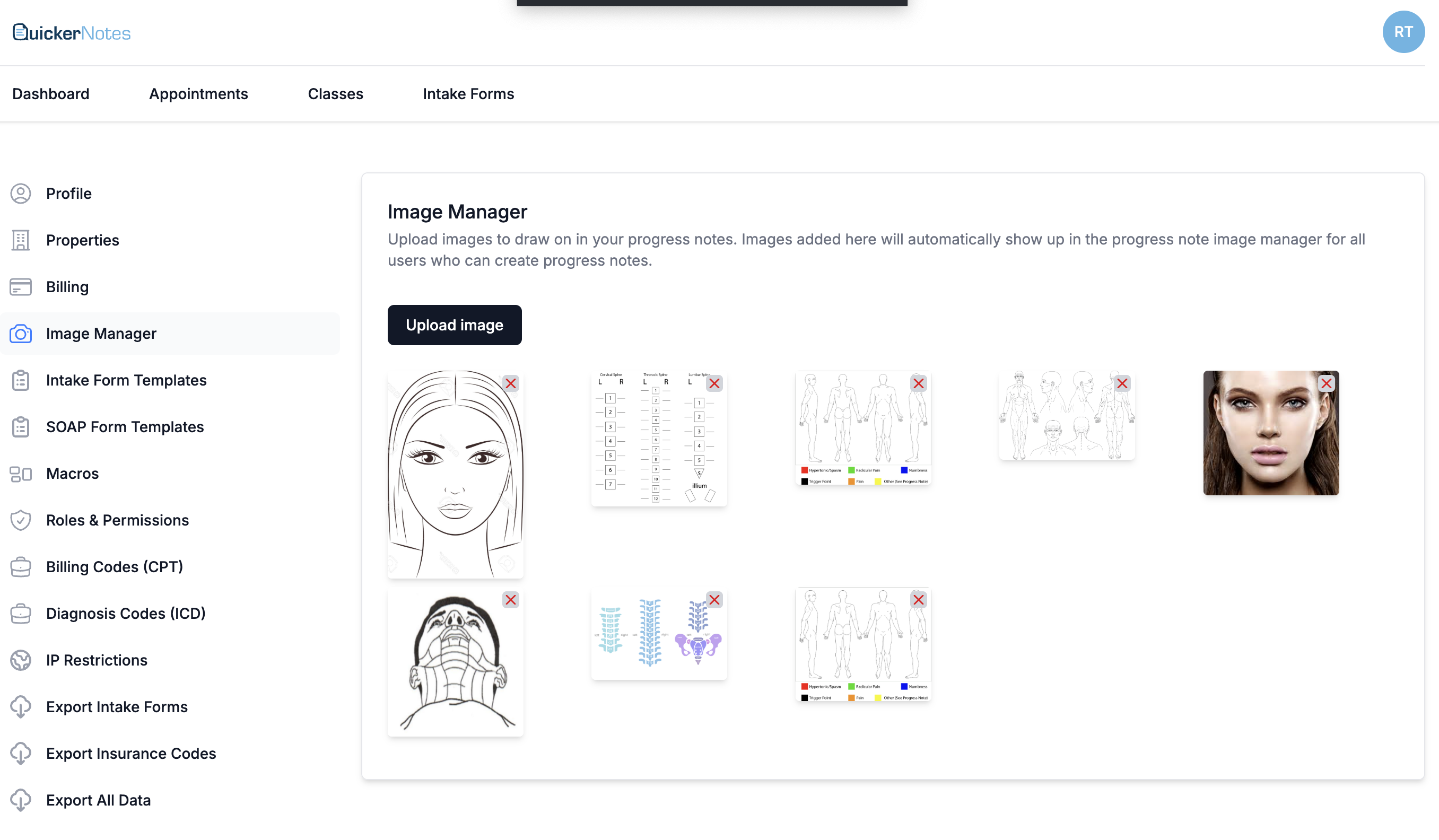 The Image Manager lets your team upload and store images for use inside progress notes.