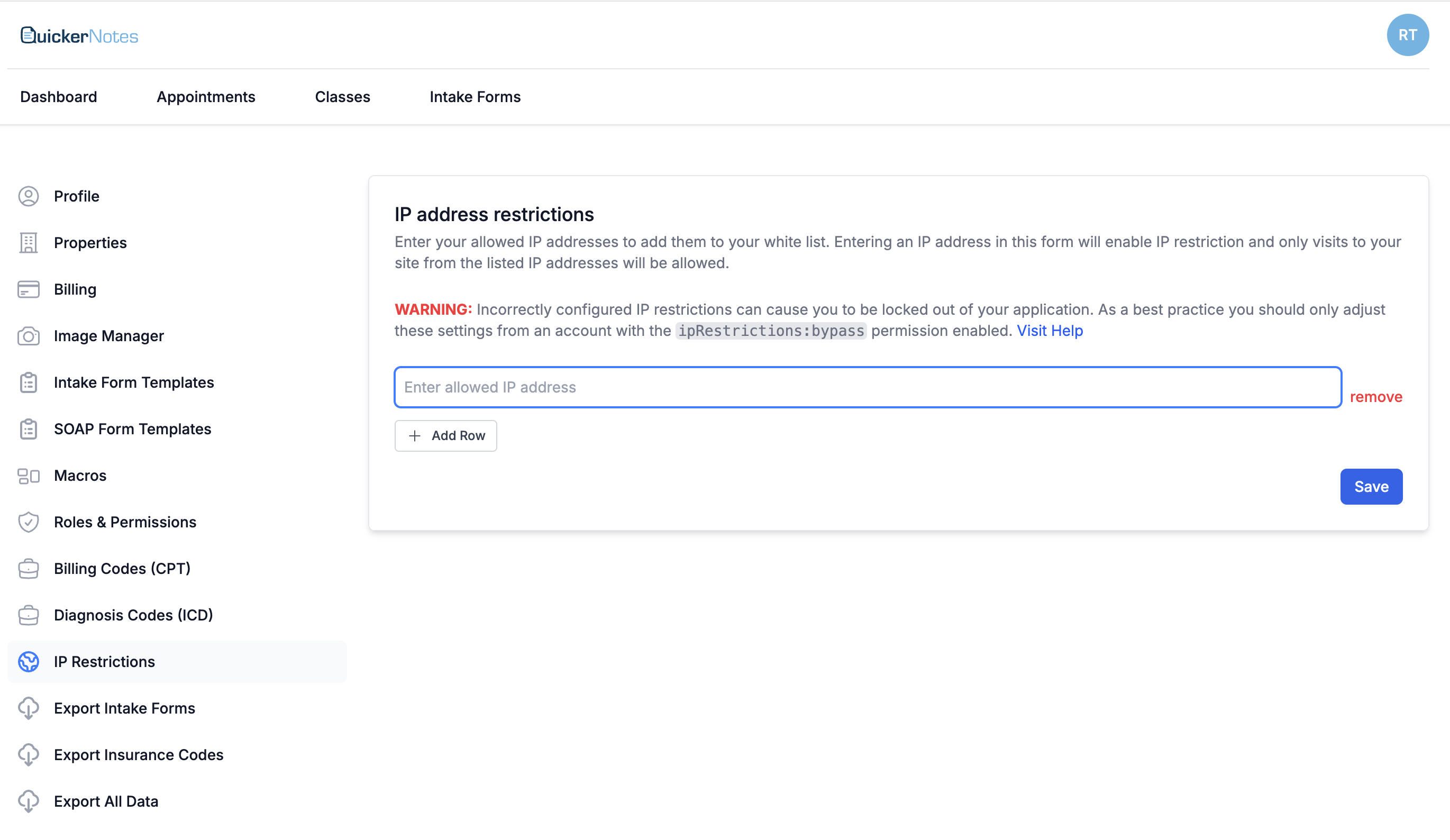 This prevents accidentally locking yourself out if the wrong IP is entered.If you are locked out due to an incorrect IP address, contact support@quickernotes.com, and our team can help restore access.