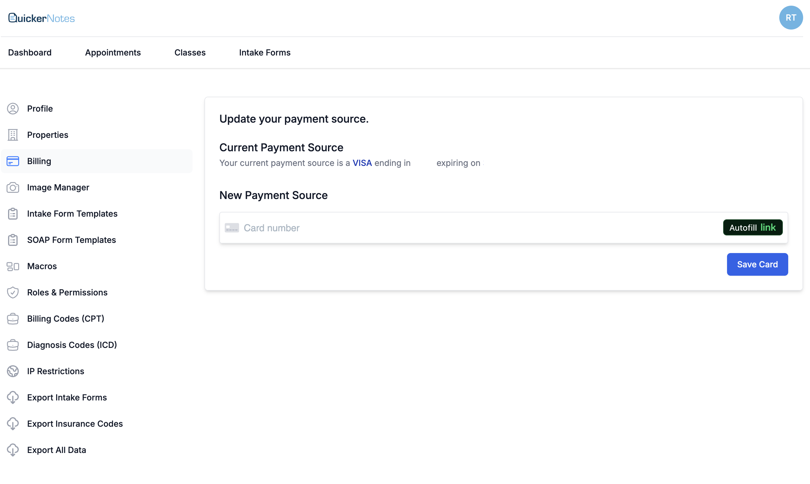 You can update your payment information directly in QuickerNotes under the Billing section.