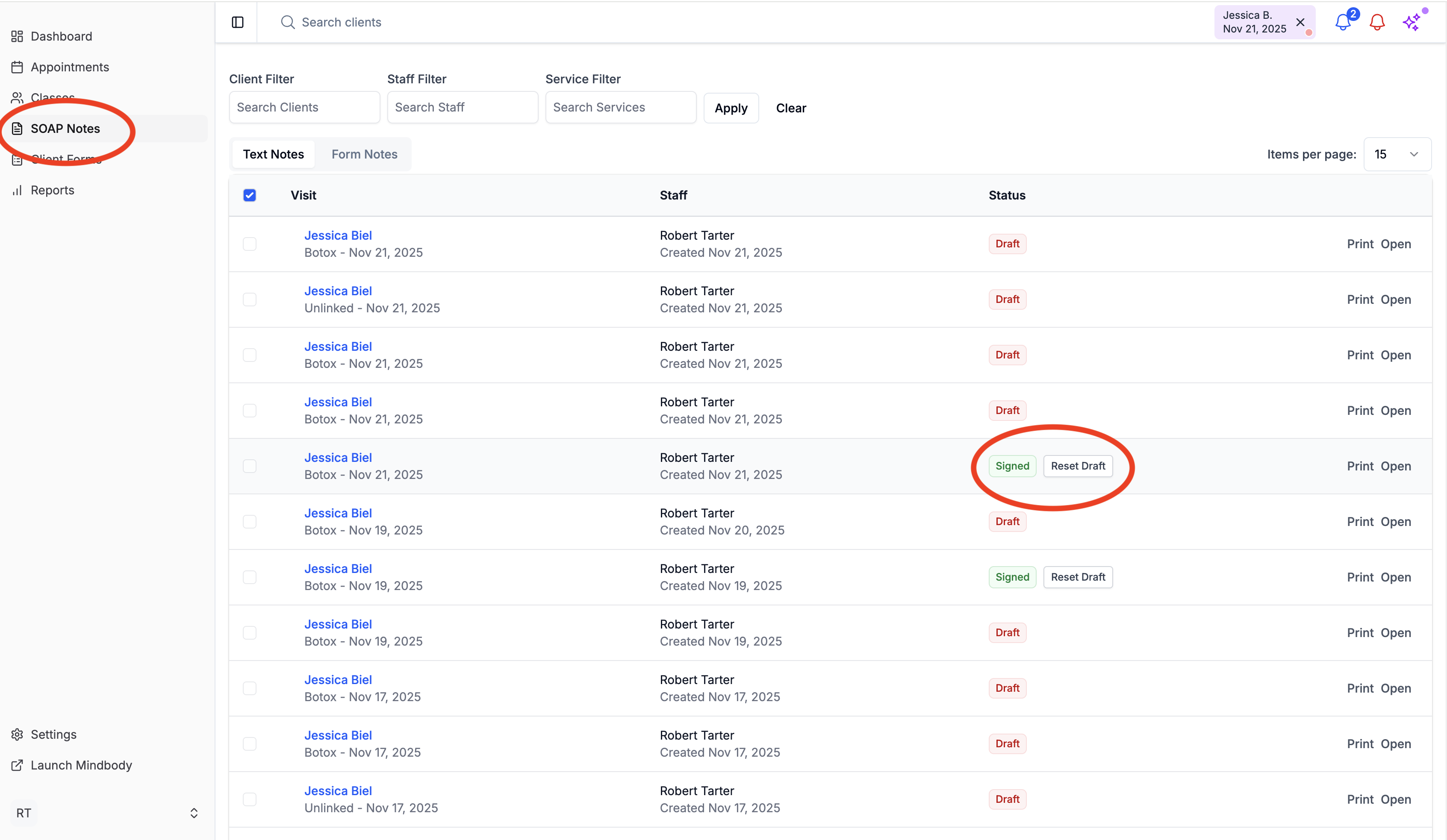 You can reset a Signed & Completed SOAP note back to Draft status. This unlocks the note for editing, removes all cosigners, and notifies them that the note has been reset.