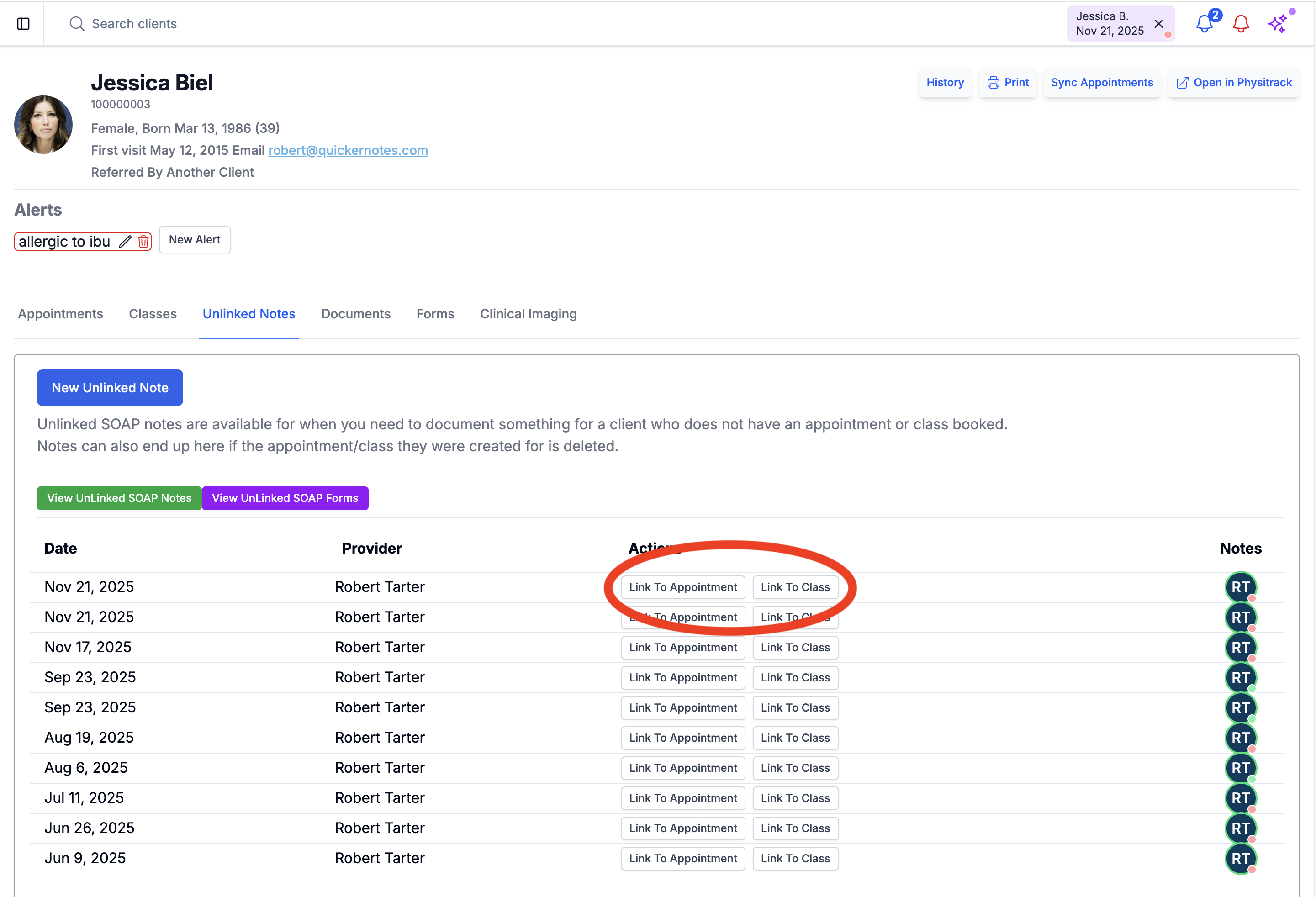 Once completed, the note appears in the client’s Unlinked Notes page.