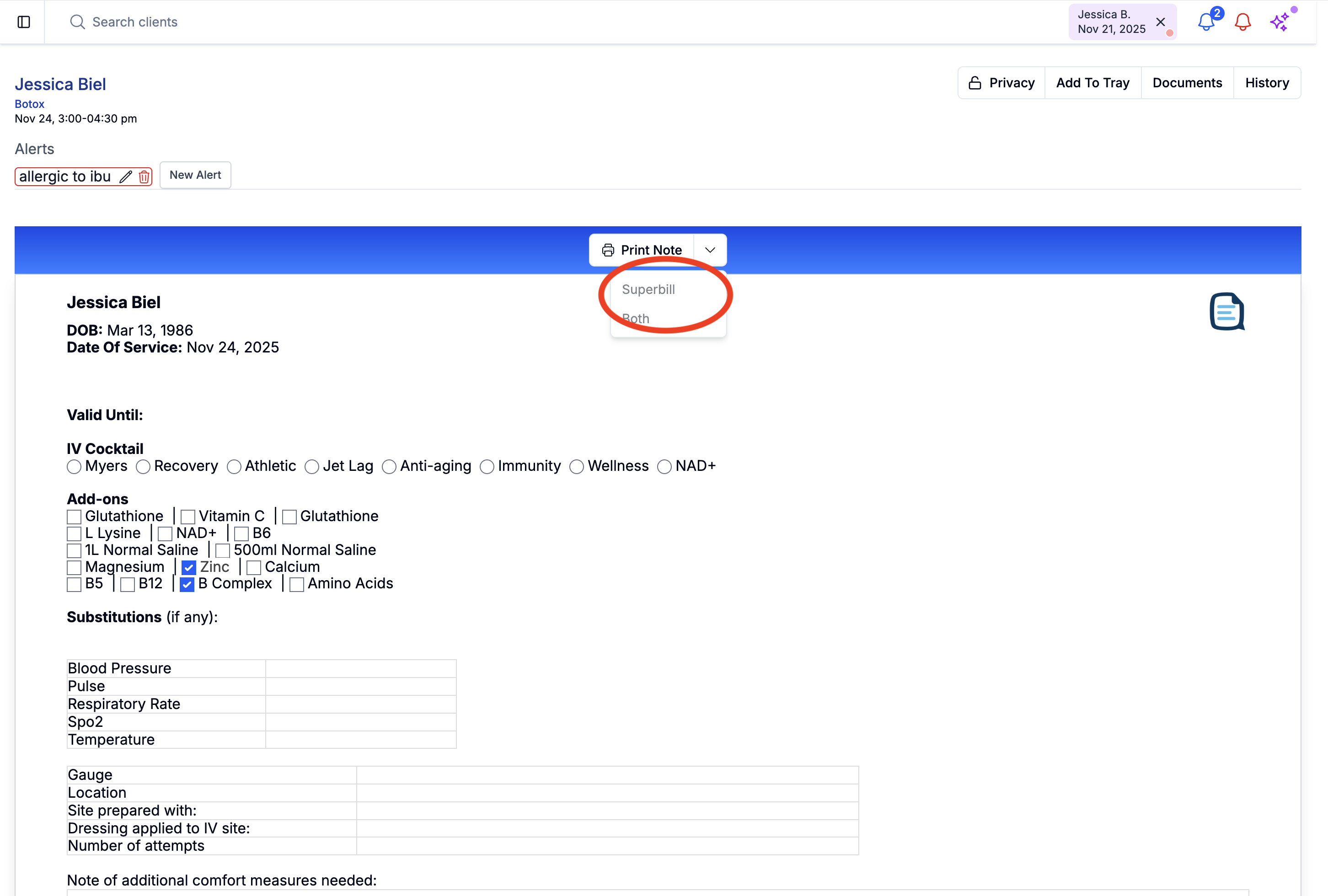 You can print a superbill (codes only) from the History tab or from the SOAP note page.