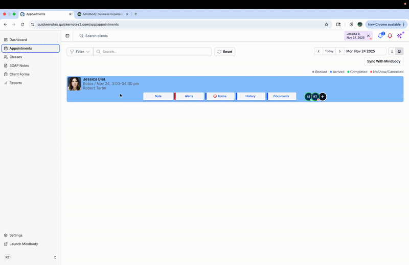 (from the appointment page, client profile, or inside a new note).Find the visit.