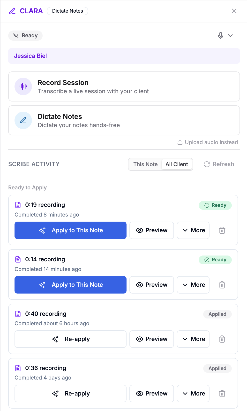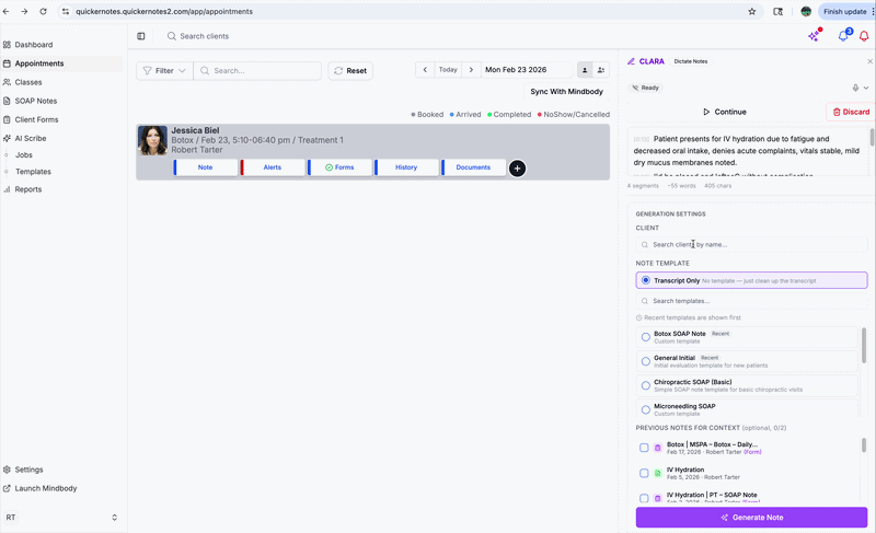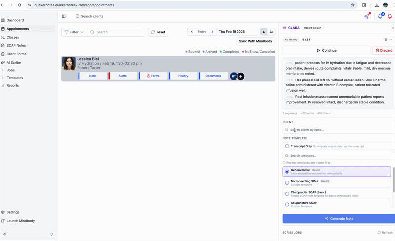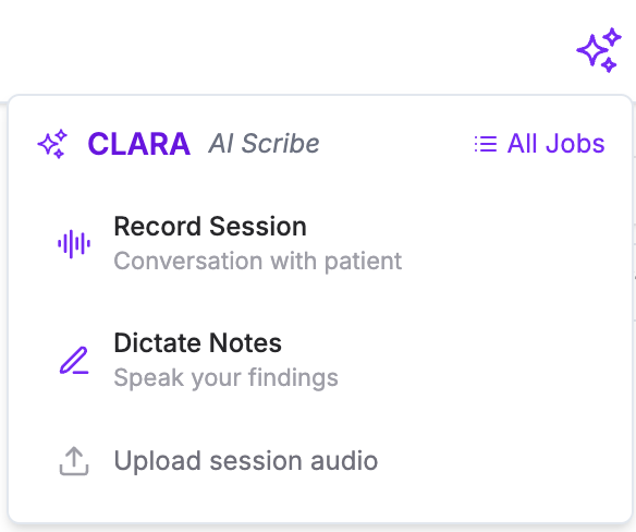 Clara AI is the AI Scribe workflow in QuickerNotes. It allows you to record or upload audio, generate draft documentation, and apply that content directly to progress notes or form notes.