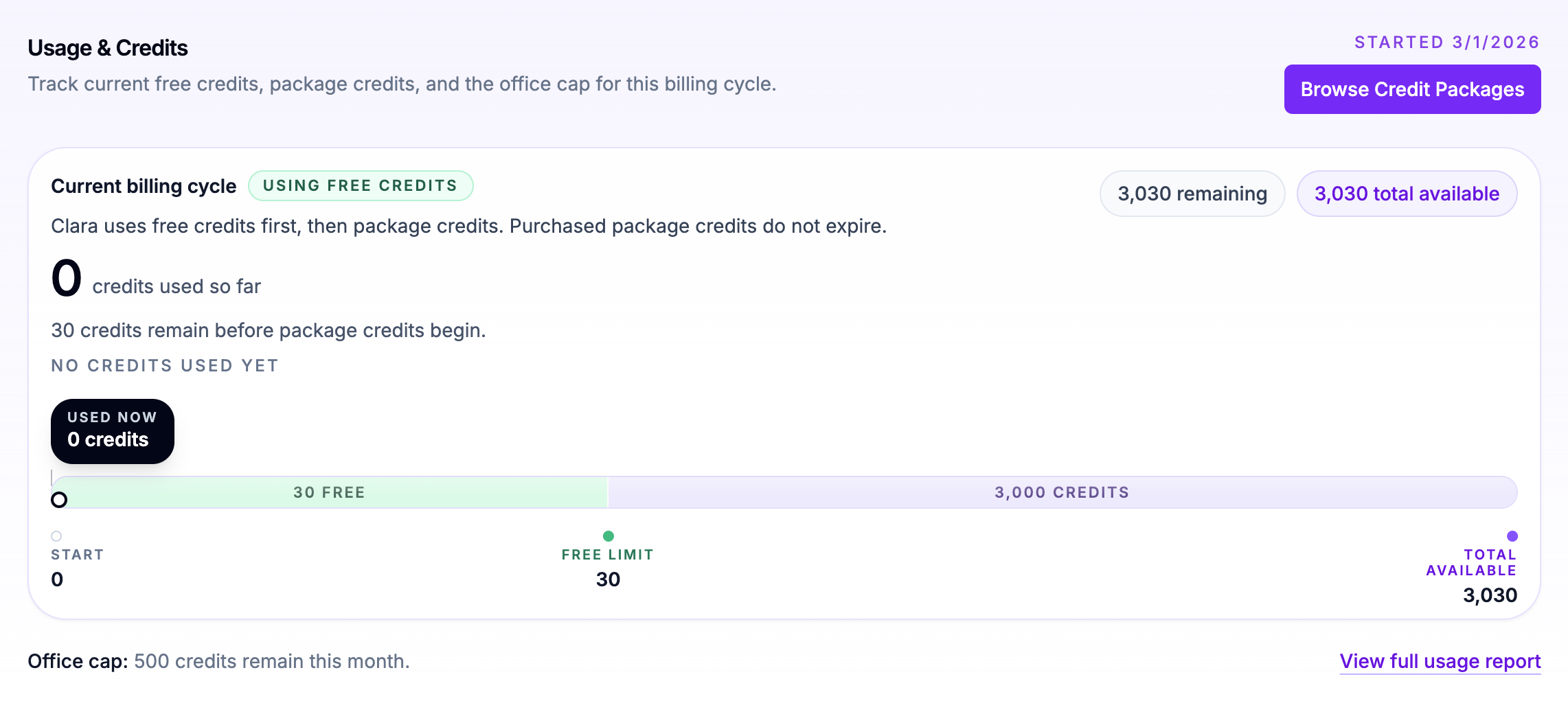Every office receives 30 free Clara credits per month, which are used before purchased credits.