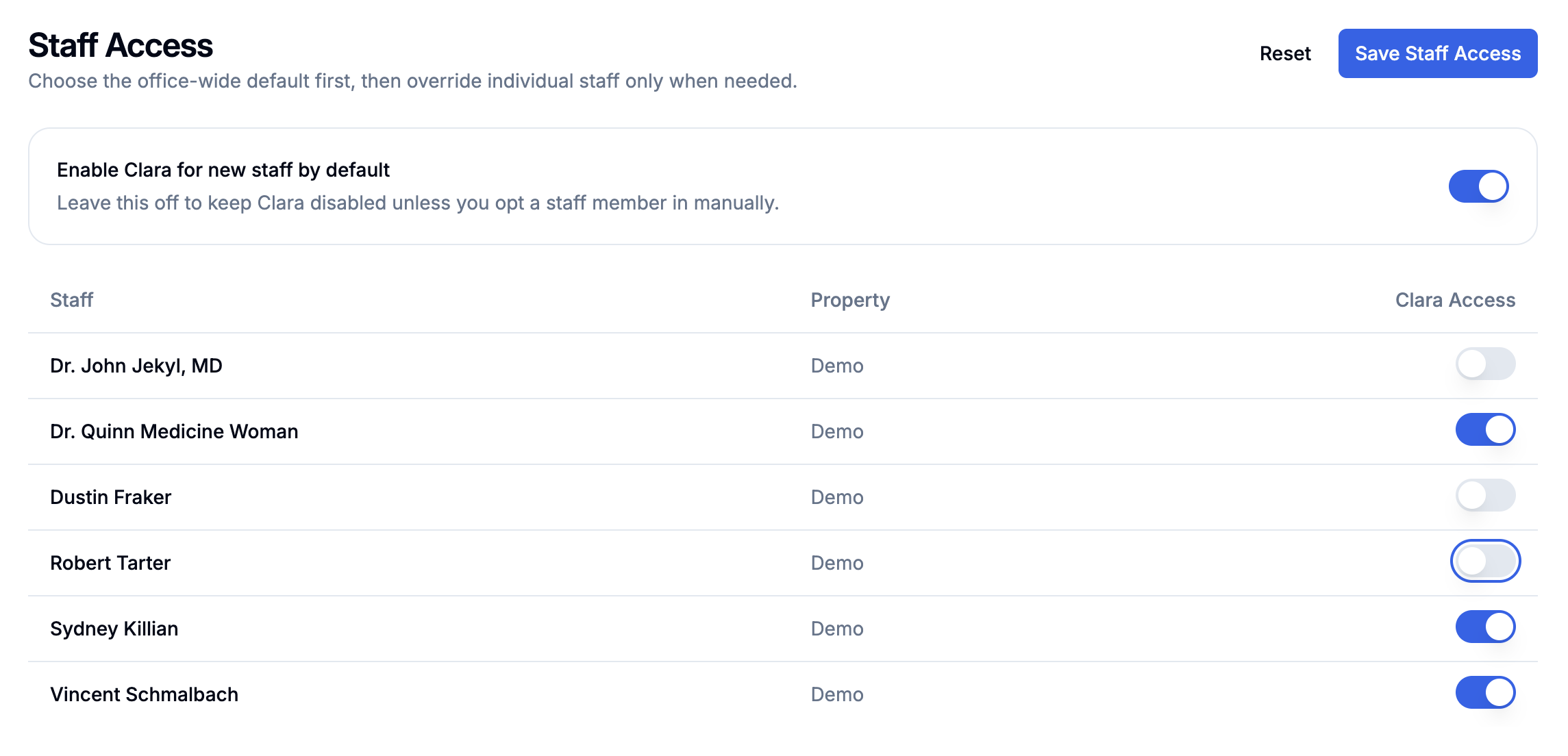 Toggle Users to allow specific staff members to use Clara.